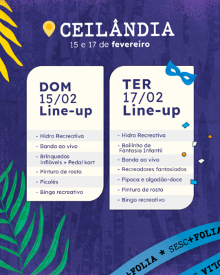 O roteiro do Carnaval em Brasília vai ganhar paradas especiais nas unidades do Sesc-DF. Nos dias 15 (domingo) e 17 (terça) de fevereiro, das 9h às 16h30, o Sesc Folia 2026 promete espalhar alegria, cores e muito ritmo em Taguatinga Norte, Gama, Guará e Ceilândia, com uma programação gratuita pensada para todas as idades.