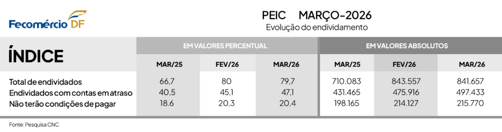 Segundo o levantamento, o percentual de famílias endividadas no DF passou de 80,0% em fevereiro para 79,7% em março, uma queda de 0,3 ponto percentual, mantendo-se praticamente estável. Apesar do ligeiro recuo na comparação mensal, o indicador segue muito acima do registrado no mesmo período do ano passado, quando estava em 66,7%, em março de 2025.