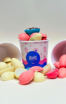 Entre os destaques está o lançamento dos Egg Bites, uma collab divertida, ousada e visualmente encantadora. As sobremesas são feitas com as cascas de chocolate dos ovos de Páscoa da Mr. Brownie, coloridas nos tons vibrantes da Happy Harry, e recheadas com gelatos artesanais da marca. Já entre os sabores estão fragola, na cor rosa, pistache, na cor branca e Fior di Latte com Brigadeiro, na cor azul.