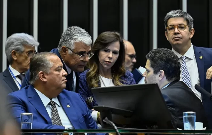 Ler maisRelator, Eduardo Gomes (E) conversa com Davi Alcolumbre e outros senadores durante a sessão O Congresso Nacional aprovou, nesta terça-feira
